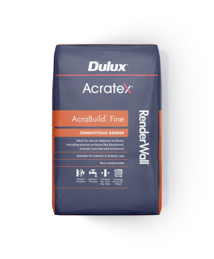Acratex® RenderWall® Acrabuild® Fine is a pre-packaged, dry mix cement render used as a low/medium build levelling coat over brick and block in a two-pass application. It is acrylic polymer modified, has a low cement content and has a fine surface finish. This product is only available in Queensland and NSW.