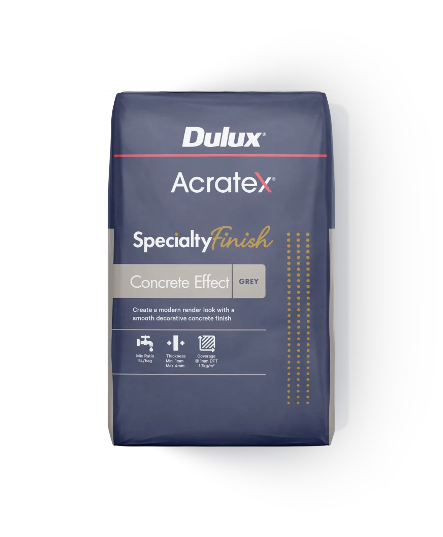 Acratex® Specialty Finish Concrete Effect Grey is a prepacked Polymer Modified cement texturing compound supplied in a dry powder requiring the addition of clean water to produce an even "Smooth" finish to suitably prepared substrates. Specialty Finish Concrete Effect Grey is designed to produce an aesthetic appealing precast concrete finish.