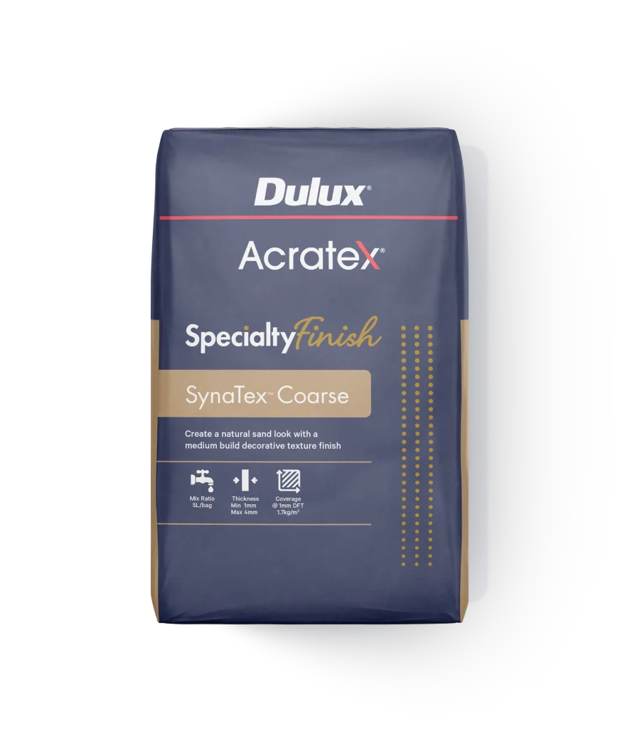 Acratex® SynaTex® Coarse is a Polymer Modified, pre blended dry mix, cementitious render-texture designed to produce a 12mm sand profile decorative texture ready for finishing with Acratex® AcraShield® Advance, AcraSkin™ or Elastomeric performance topcoats. Supplied in dry powder form, SynaTex® Mineral Texture Coarse requires only the addition of clean potable water to produce a mortar texture mix that exhibits minimal drying shrinkage and positive adhesion to clean, sound, porous masonry substrates.