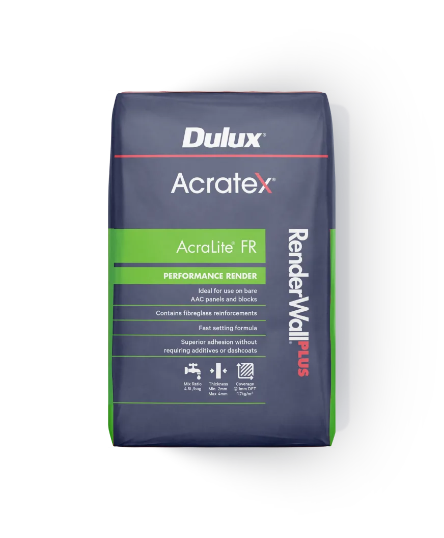 Dulux Acratex® RenderWall® Plus Acralite® FR is a polymer modified and fibre reinforced cementitious skimcoat render designed for application to AAC Panels. It is a trowel applied skimcoat render and is designed as a preparatory product for subsequent Dulux Acratex® texture systems.
