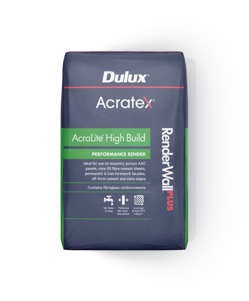 Acratex® Acralite® High Build is a pre-blended Light Weight High Build fibre reinforced High Polymer cementitious base coat. The carefully controlled formulation contains light weight filler, fibres, Portland Cement, Acrylic Polymer and cement modifying agents to provide excellent base coat properties for subsequent levelling and finishing applications. Supplied in dry powder form, RenderWall Plus AcraLite HB requires only the addition of clean potable water to produce a mortar adhesive that exhibits minimal drying shrinkage.