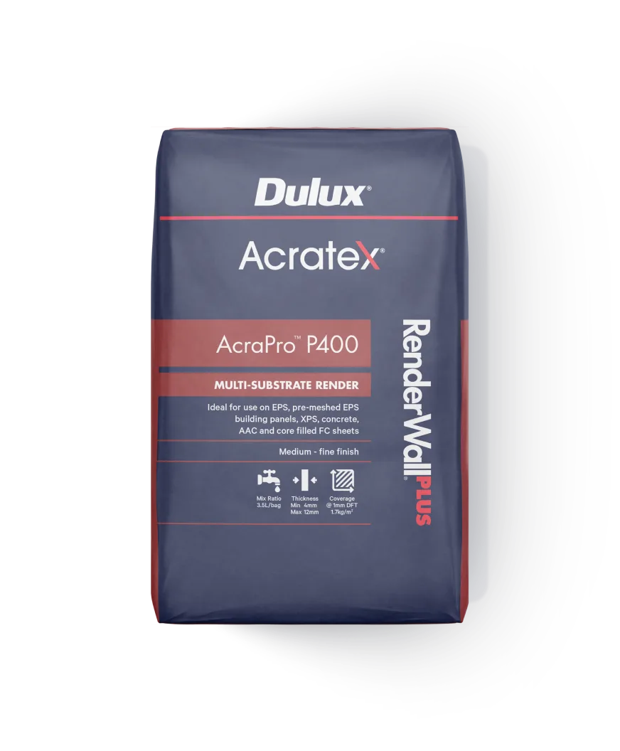 Acratex® RenderWall® Plus AcraPro® P400 WG is a pre-blended high polymer cementitious base coat which provides positive adhesion to stable low absorbency substrates such as Expanded Polystyrene (EPS) and pre-meshed EPS building panel. It is a trowel-applied render and is designed as a preparatory product for subsequent Dulux® Acratex® texture systems.
