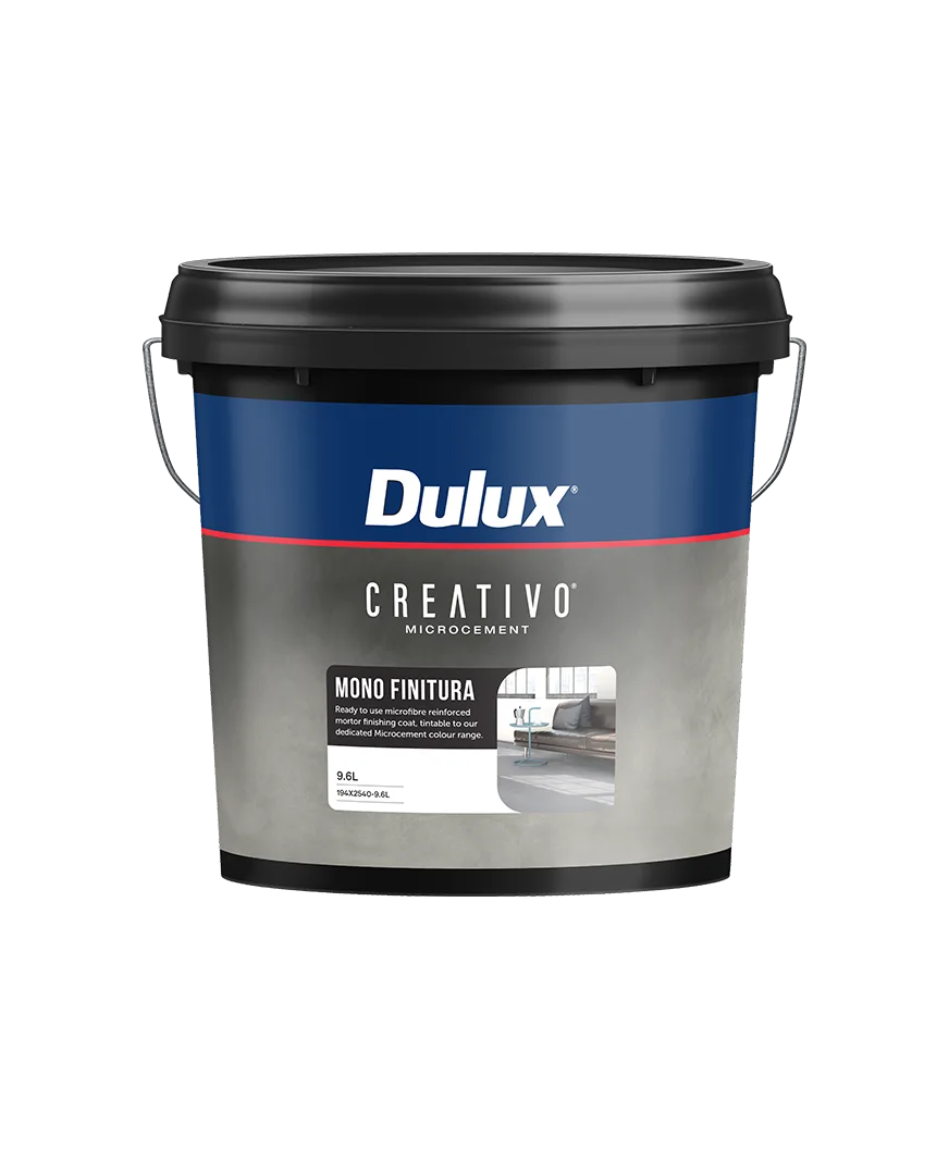 Microcement Mono Finitura is a ready to use microfibre reinforced mortar finishing coat, tinted to the desired Dulux Microcement colour. Composed of special resins that provide excellent adhesion to the substrate, mineral aggregates with balanced grain size and special additives to improve workability and performance.