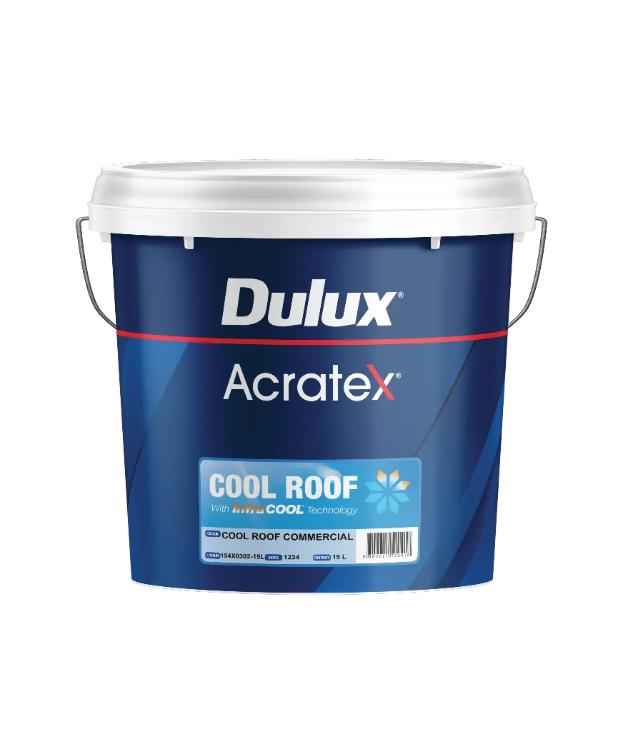 Dulux Acratex® Cool Roof Commercial White Membrane is a high build, pigmented, water based, 100% acrylic coating with excellent total solar reflectance (TSR). Reflects up to 90% of the sun’s total light energy before it is absorbed and converted as heat, keeping the roof surface cooler. Specifically formulated for low dirt pickup, added mould, algae protection in a low sheen finish to reduce glare and in order to maintain solar reflectance properties.