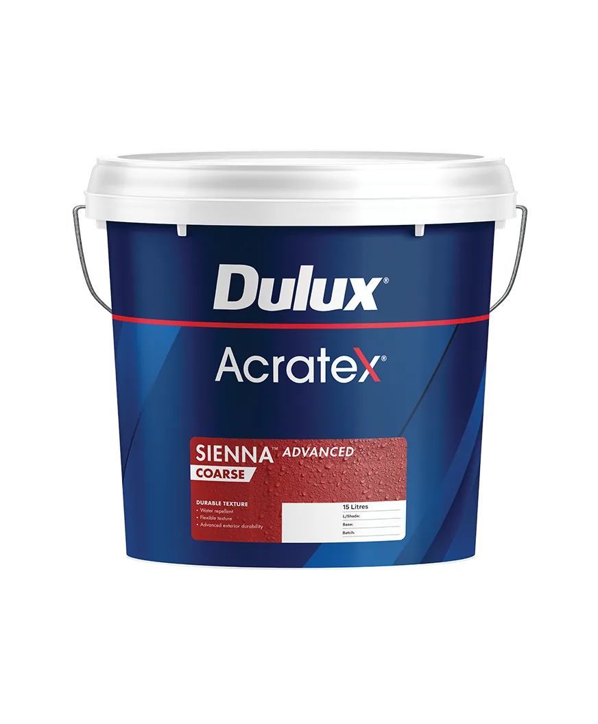 Acratex® Sienna™ Advanced is a tintable, trowel applied, decorative texture coating producing a uniform sand-texture profile with classic Tuscan looks that features water beads technology. The coloured granular finish is enhanced with a finish coat of Dulux Roof Membrane Gloss Glaze producing a subtle mineral glistening effect to highlight the features of any project.