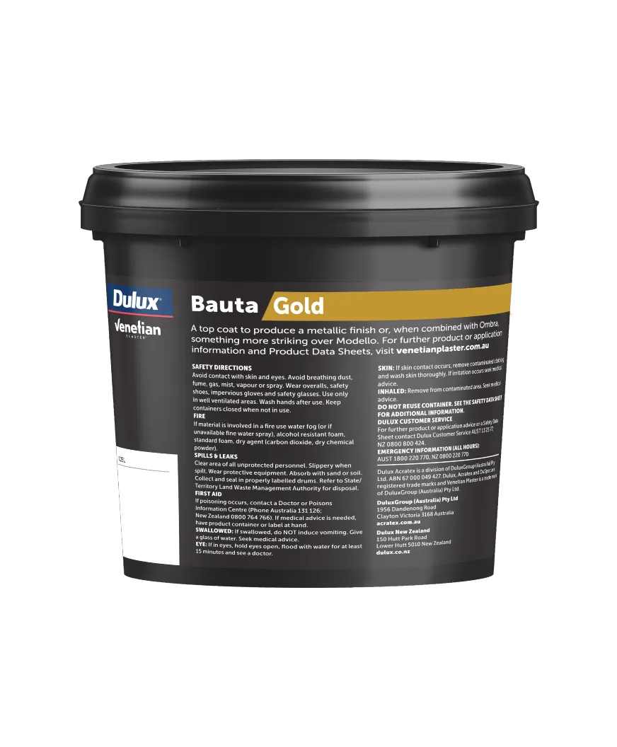 Dulux® Venetian® Plaster Bauta is a water-based decorative top coatings to create striking effects. Available in Silver, Gold, Bronze & Copper for interior surfaces that have been coated with Venetian Plaster. Suitable only on MODELLO.