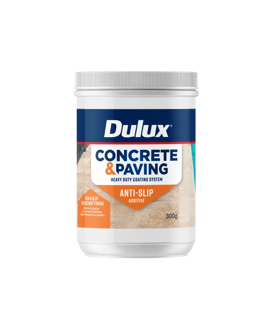 Dulux Concrete & Paving Anti-Slip Additive is specially formulated for use in Dulux Concrete & Paving Protective Sealer. Ideal for use in areas that become slippery when wet such as pool surrounds, sloping paths and outside steps. Dulux Concrete & Paving Anti-Slip Additive achieves a minimum of a P4 slip rating when applied as directed, as text to AS 4586:2013*. *NOTE: Due to slip risk do not apply to gradients greater than 8:1. If unsure about your gradient please contact Dulux Help & Advice AUST 12 25 25, NZ 0800 800 424.
