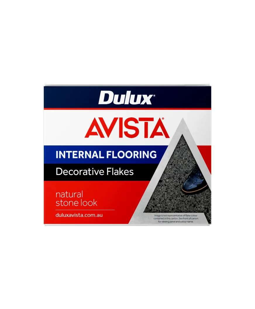 Dulux Avista Natural Stone Look Flake to be applied into second coat of Dulux Avista Waterbased Epoxy, while wet. Refer to waterbased epoxy TDS for mixing & application instructions.