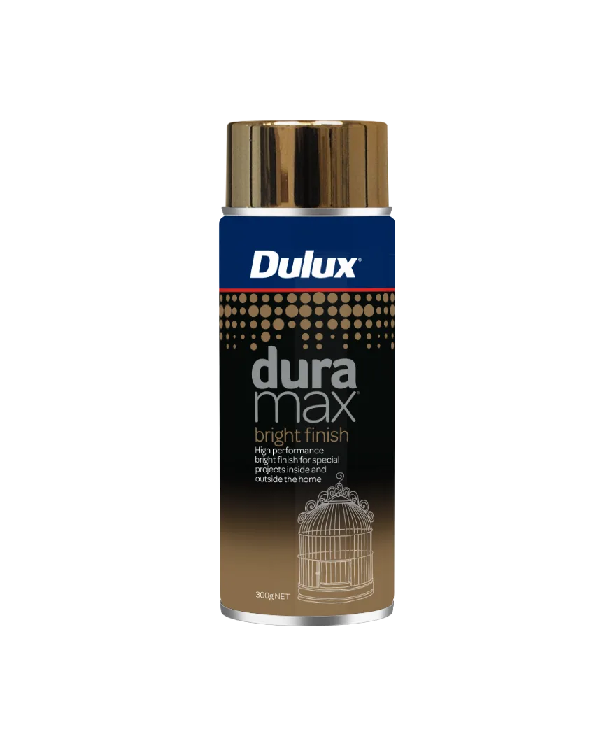 Dulux Duramax® Bright Finish is a fast-drying spray paint delivering a brilliant bright finish on special projects inside and outside the home. The unique Dulux technology delivers bold and stunning finishes in Bright Gold, Copper Rose and Silver and is ideal for use on all primed smooth surfaces such as metal, wood, glass and plastic.