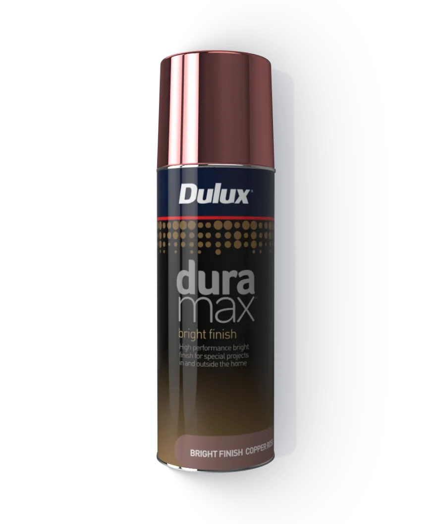 Dulux Duramax® Bright Finish is a fast-drying spray paint delivering a brilliant bright finish on special projects inside and outside the home. The unique Dulux technology delivers bold and stunning finishes in Bright Gold, Copper Rose and Silver and is ideal for use on all primed smooth surfaces such as metal, wood, glass and plastic.