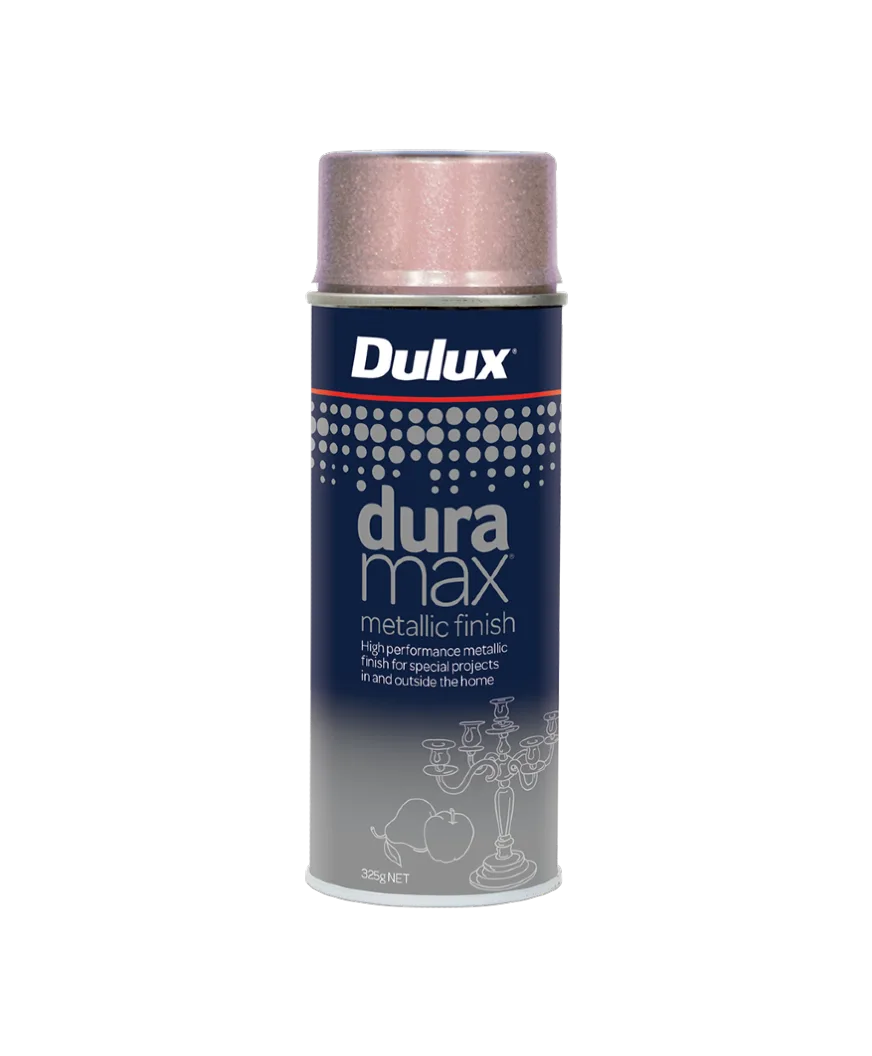 Dulux Duramax® Metallic Finish is a fast-drying acrylic spray paint that delivers superior colour durability and exceptional coverage on wood, metal and most plastic. The unique combination of technology delivers longer lasting and fade-resistant colour. Its high opacity and self-priming nature on most surfaces allows projects to be completed faster. The comfort tip with a wider finger pad helps deliver an even coat of paint and reduces fatigue when spraying for extended periods of time.