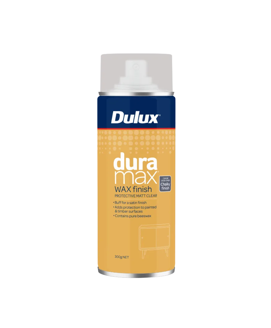 Dulux Duramax® Wax Finish Protective Matt Clear is a fast-drying protective spray paint that can be buffed to satin finish. It can be used on painted and timber surfaces, polished marble, granite and metals to add long-term protection against moisture, chipping, cracking and common household cleaners.
