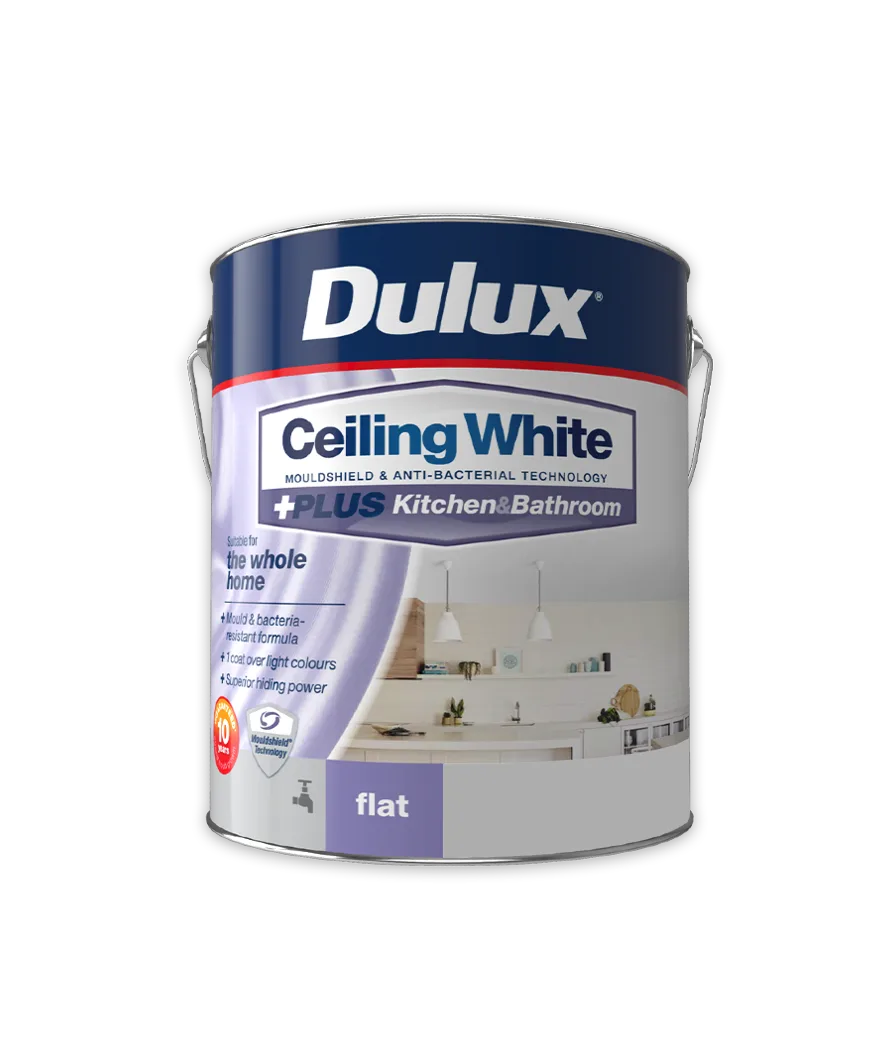Dulux Ceiling White +PLUS Kitchen&Bathroom is an advanced ceiling formulation with Mouldshield® technology protection. It is tintable to light colours and has superior opacity to provide excellent hiding power, making it perfect for the whole home.