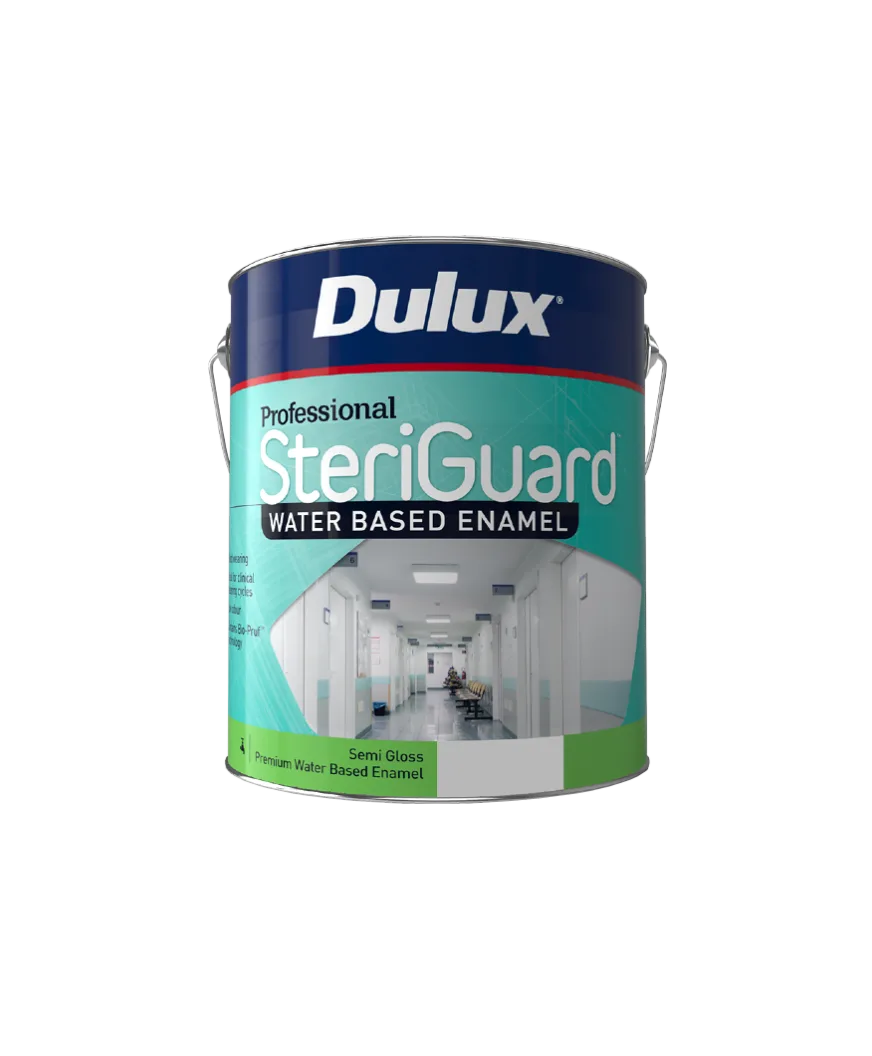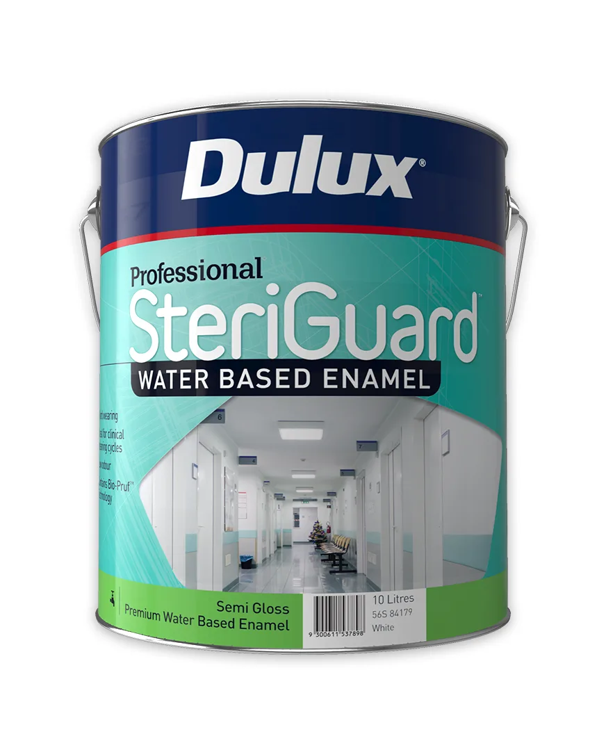 Dulux Professional® SteriGuard® Water Based Enamel is a premium, hard wearing interior/exterior water-based enamel designed to withstand cleaning cycles in clinical environments. The low odour formula ensures quick return to service with less disruption. Dulux Professional® SteriGuard® Water Based Enamel when combined with clinical cleaning programmes, helps assist in the protection against mould and bacteria to keep surfaces clean and help maintain good indoor air quality. Available in Trade Outlets only, applying this product may require professional painter assistance. Check your local stockist for details.