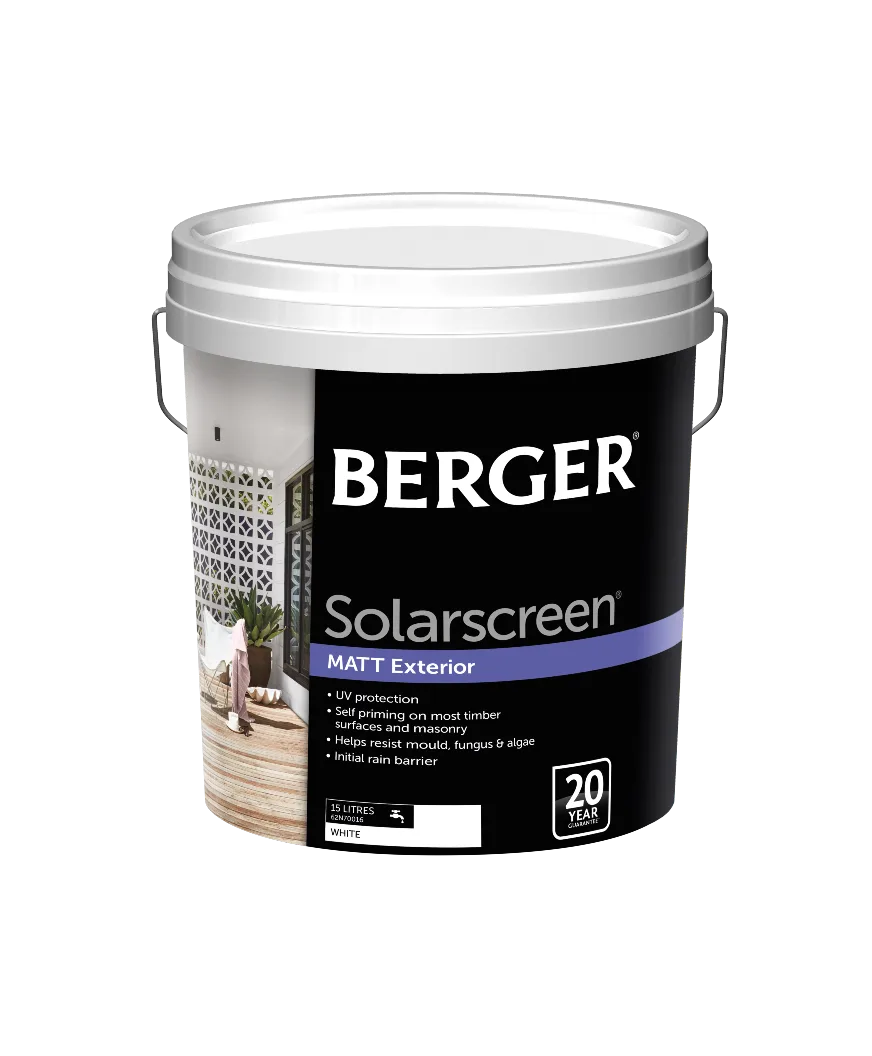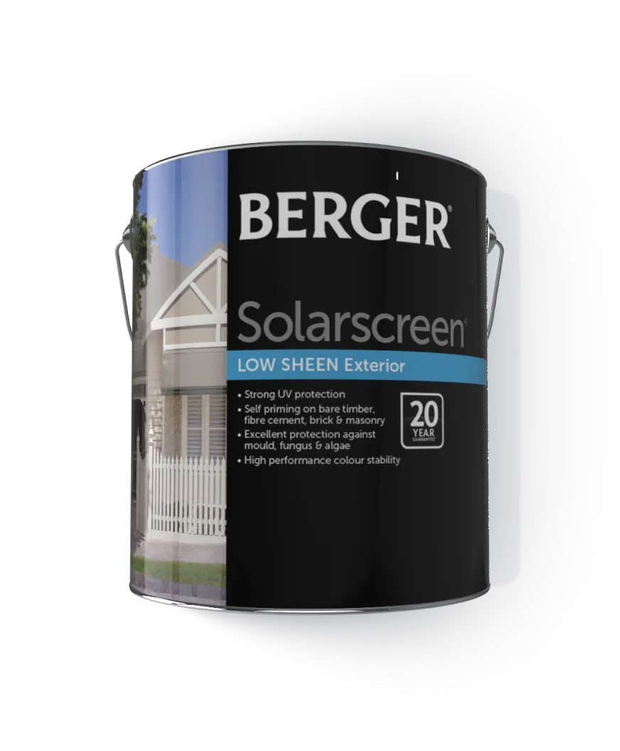 Berger Premium Solarscreen Exterior Matt Acrylic is tested under our sun to deliver strong UV proctection based by a 20 year guarantee against peeling, blistering and flaking. Self priming on most timber surfaces and masonry, Berger Solarscreen offers resistance against mould, fungus and algae. Berger Solarscreen has long lasting colour, is hard wearing and designed to last.