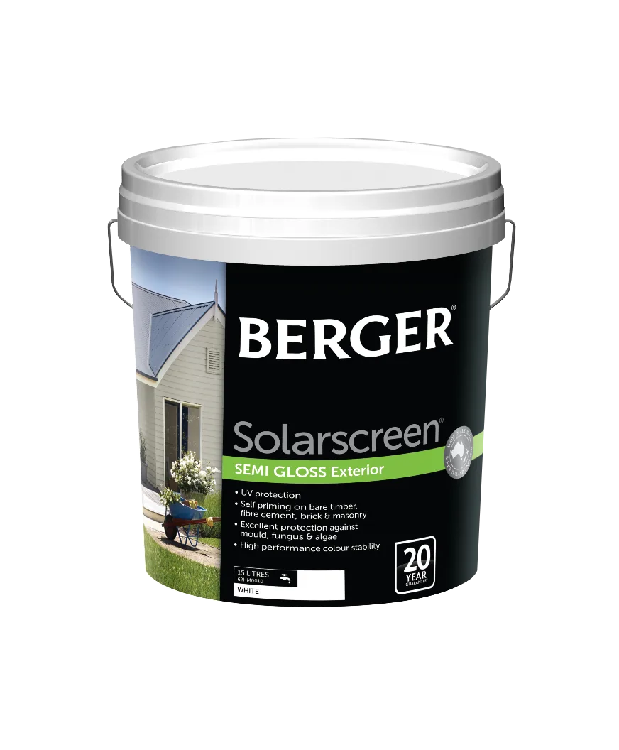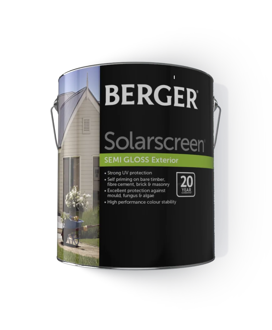 Berger Solarscreen is tested under our hot sun, to deliver strong UV protection backed by a 20 year guarantee against peeling, blistering and flaking. Self priming on bare timber, fibre cement, brick and masonry, Berger Solarscreen offers excellent protection against mould, fungus and algae. Berger Solarscreen has high performance colour stability, is hard wearing and designed to last.