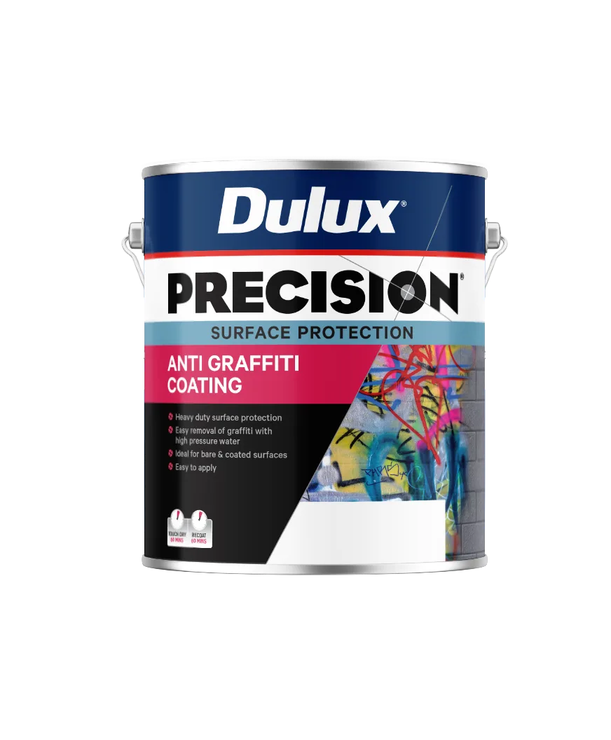 Dulux Precision Anti Graffiti Coating is suitable for Interior and exterior use directly onto a variety of bare and painted surfaces including; timber, concrete, brick, render, mineral silicate paint, stone paint.