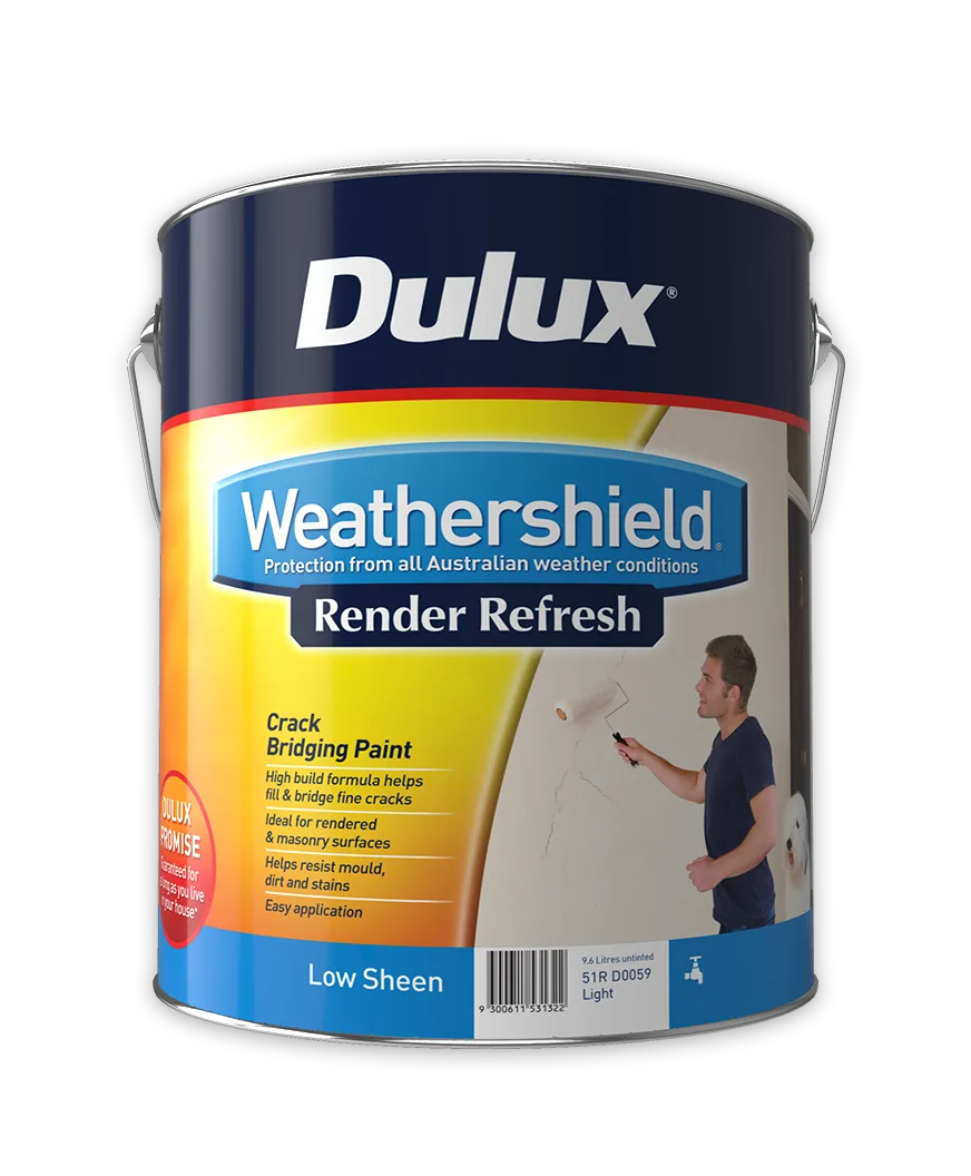 Dulux Weathershield® Render Refresh is a high build, highly flexible acrylic coating designed to achieve a render finish. Render Refresh is ideal for previously painted bricks, concrete, fibre cement board and masonry. It gives a tough, flexible finish for long life protection from all Australian weather conditions.