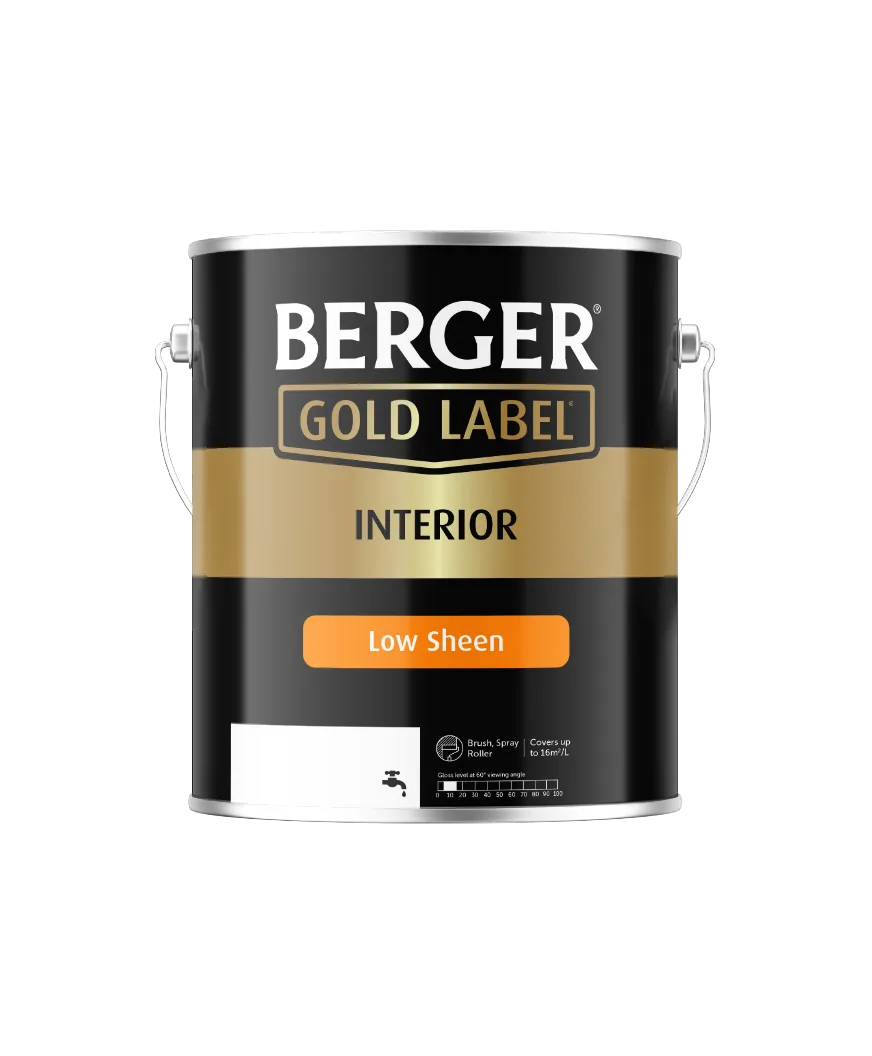 Berger Gold Label® Interior Low Sheen Acrylic is a high quality, washable, acrylic low sheen finish with good opacity, adhesion and appearance. It has good wet edge for lapping, minimum roller fly off and has good resistance to staining.