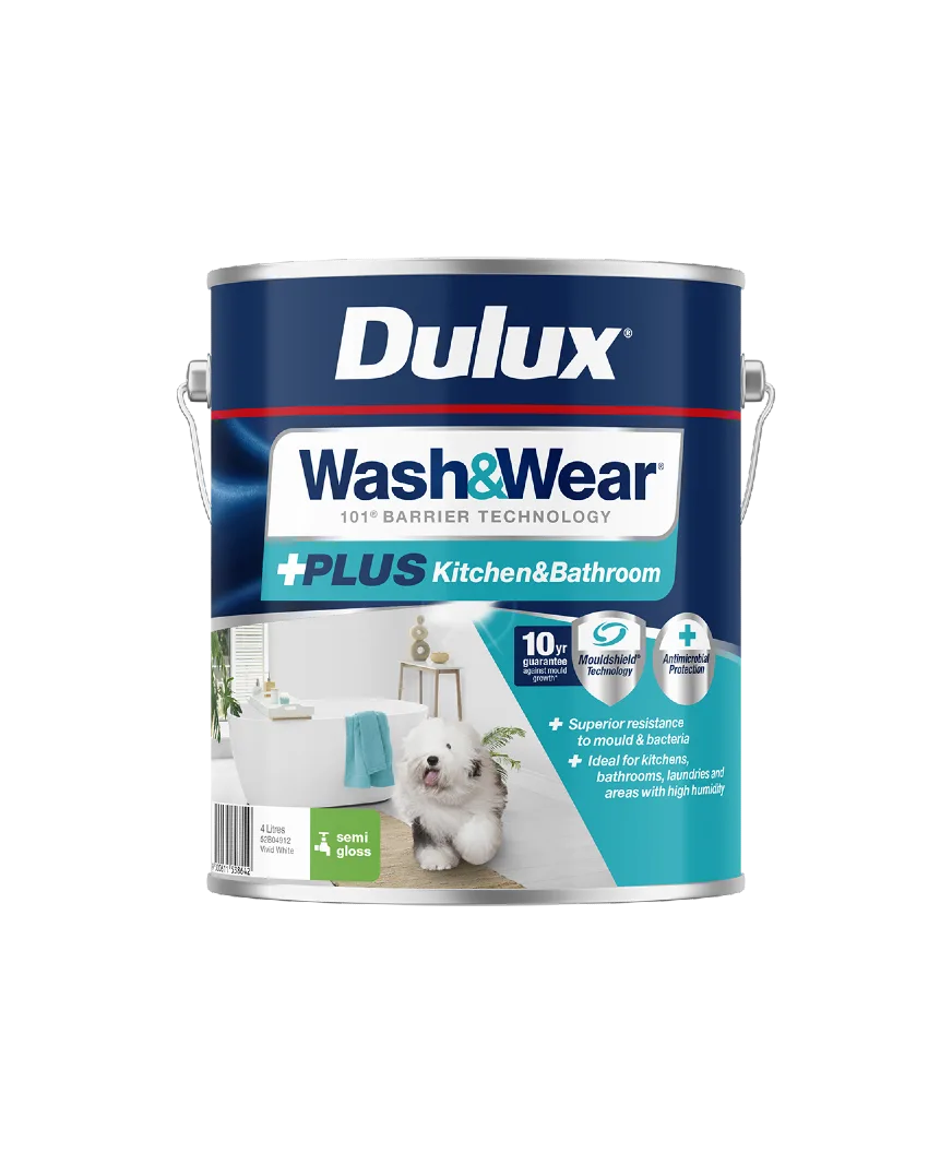 Dulux Wash&Wear® +PLUS Kitchen & Bathroom Semi Gloss was developed to withstand humid or damp environments. The hard-wearing surface formed by Wash&Wear’s® exclusive 101 Barrier Technology® is fortified with a powerful mould inhibitor and water-repellent properties so you can wipe away most marks with a wet cloth. This gives lasting protection to rooms with damp or humid conditions such as kitchens, bathrooms and laundries, meaning your walls will look freshly painted for years.
