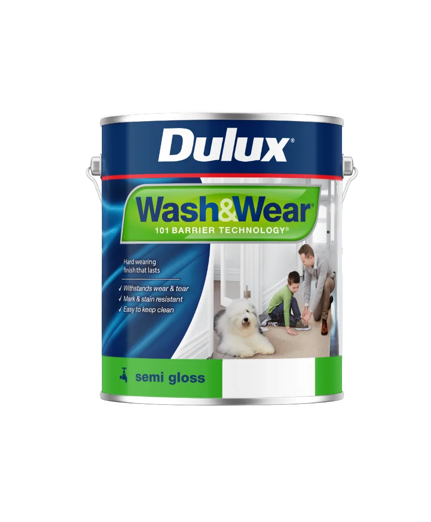 Dulux Wash&Wear® Semi Gloss provides a mid-level sheen that works well on all walls including frequently cleaned areas and wet areas or as an alternative to enamels on doors and skirting boards. The hard-wearing finish allows you to wipe away most common marks, scuffs and stains with a wet cloth so your walls will look freshly painted for years.