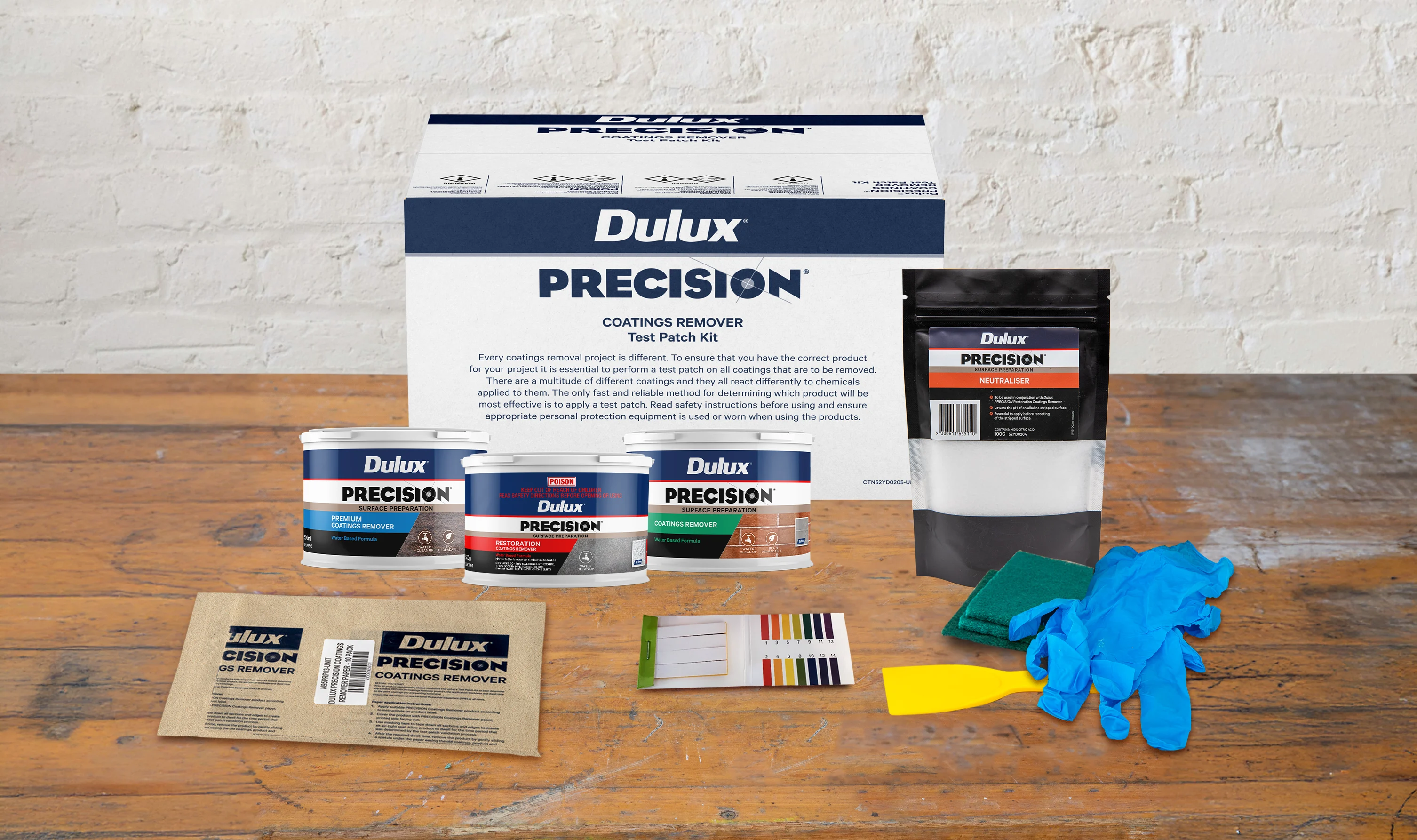 Apply each product in a 20cm x 20cm test area. Repeat this process 3 times for each product.Ensure that you apply each product for the specified minimum at each dwell time and that the productis applied at the correct thickness. Refer to instructions enclosed in test patch kit for minimum film build and dwell times.Apply the enclosed Dulux PRECISION Paper, printed side out, over the Coatings Remover patchesand smooth out to remove air. Tape down all edges to protect from accidental transfer to personnelin the area or the possibility of inclement weather.On the first test patches note down in a permanent marker ‘24 hours’. On the second set note down48 hours’ and on the last ‘72 hours’. You can make these recordings directly on the paper.Be sure to take note of all specific information during the test patch: dwell time, temperature, humidityand weather conditions. During the future coatings removal project, this information will be veryimportant for project effectiveness. You can record this information directly on the paper print design. After 24 hours of dwell time you can begin checking the results of the first set of test patches. Puton rubber gloves and using the scraper, gently scrape under the remover and Dulux PRECISION paperstarting at the corner. Carefully lift the scraper, paper, coatings remover and paint in one continuousmotion. Once the coating has been removed, immediately scrub the surface (using the scouring padsprovided and water). Contain all remnants and dispose of responsibly. Surface should now be cleanand free of paint film.If the coating has not been removed entirely, you will need to wait for the 48 hour or 72 hour testpatch results. Product efficacy depends on proper film build and the dwell interval.