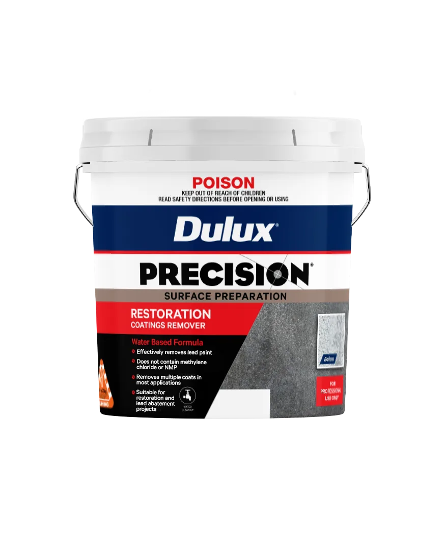 Dulux PRECISION® Restoration Coatings Remover is a water-based product, which is effective for removing multiple layers of architectural and industrial coatings from interior and exterior surfaces. Dulux PRECISION® Restoration Coatings Remover is safer to use than traditional coatings removal systems, as it is designed to trap aged coatings in a wet state, preventing airborne dust particles.