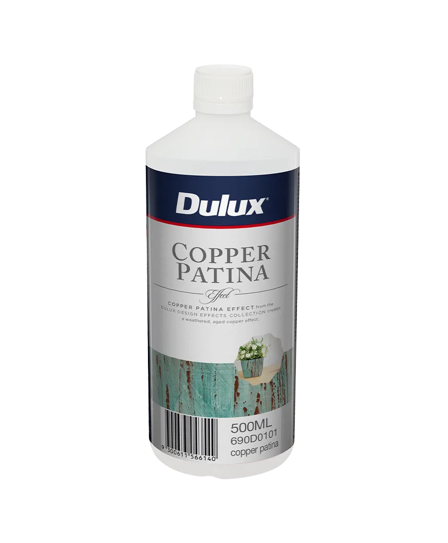 Apply over Dulux Copper Effect. Best results are achieved if treatment begins as soon as the final coat of Dulux Copper Effect is touch dry (approx. two hours) and within 12 hours of application. Apply Dulux Copper Patina solution by brush or muslin in a random pattern. The aged effect will continue to develop over days and weeks. A second coat can be applied if required. Do not apply a clear sealer as this can remove or damage the effect, especially when new. The level of patina will vary depending on drying time and application method. The patina can be rubbed off when touched. On exterior surfaces, patination run off may stain adjacent surfaces.