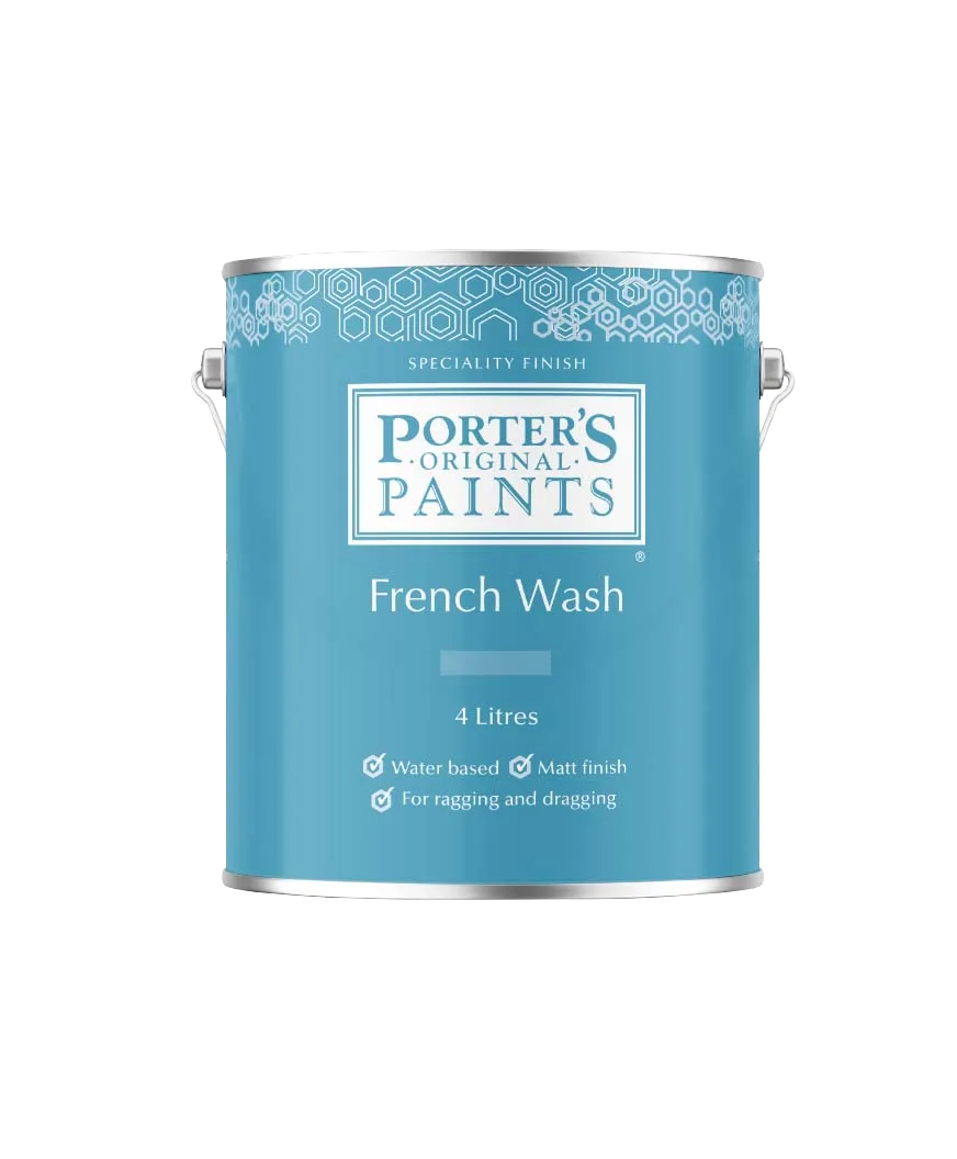 Porter’s French Wash™ creates the look of delicate broken colour - a subtle marble-like finish. Step 1 is the application of Porter’s Low Sheen Acrylic, tinted to an appropriate colour and used as a base. Step 2 is the application and ragging of the French Wash™ (usually tinted slightly darker) over the top of the Low Sheen Acrylic, creating the soft, broken colour effect.
