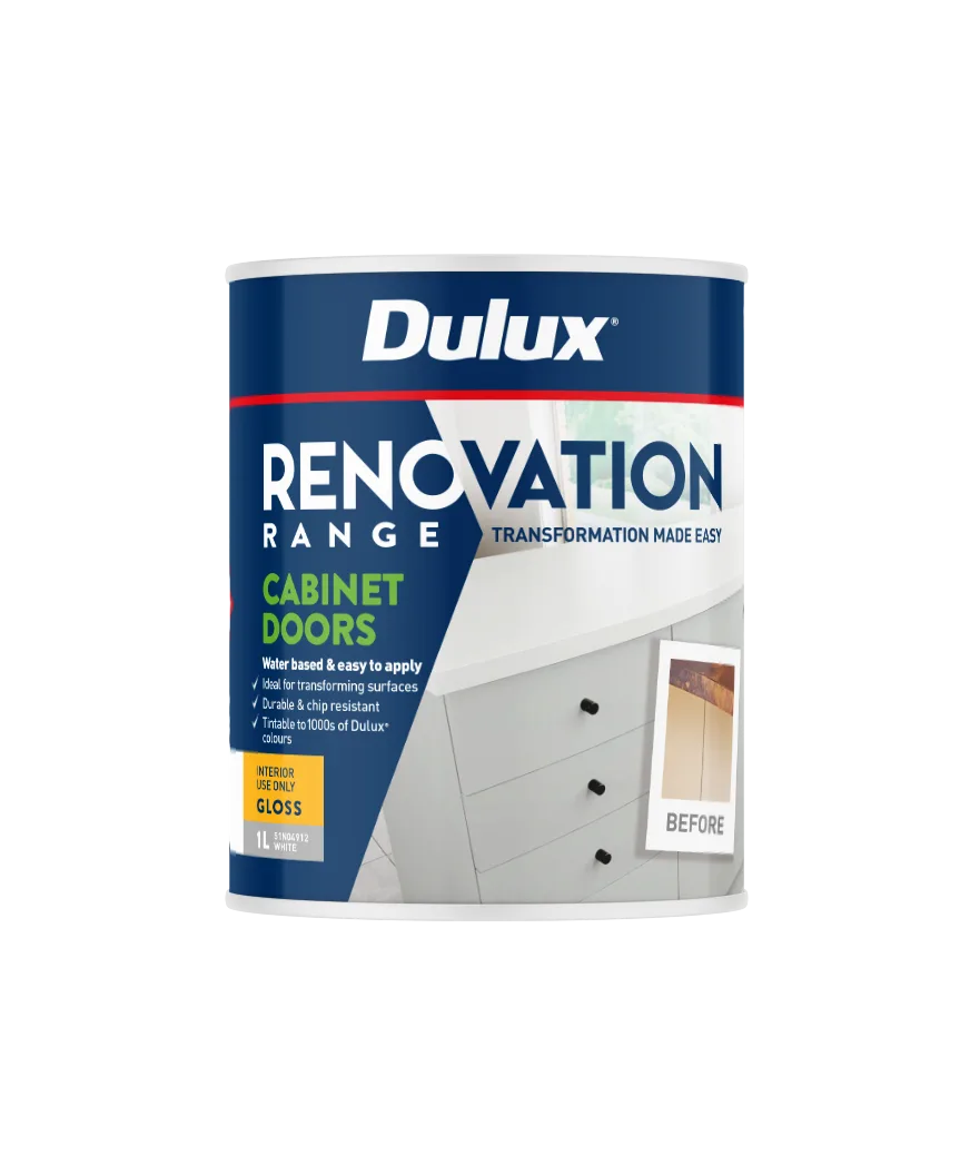 Dulux Renovation Range Cabinet Doors is a revolutionary, water-based interior coating that is perfect for surfaces in the kitchen, bathroom and laundry. It is easy to apply and provides a beautiful, durable, scratch, chip and scuff-resistant finish that you can achieve yourself.