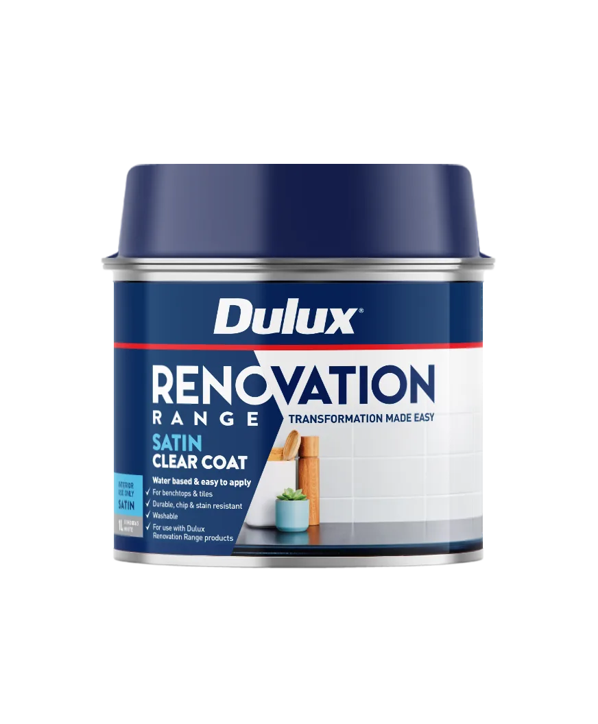 Dulux Renovation Range Clear Coat is a revolutionary, water-based interior coating designed to add a layer of protection to the Dulux Renovation Range topcoats. It is easy to apply, providing a durable, chip and stain-resistant, washable finish that you can achieve yourself.