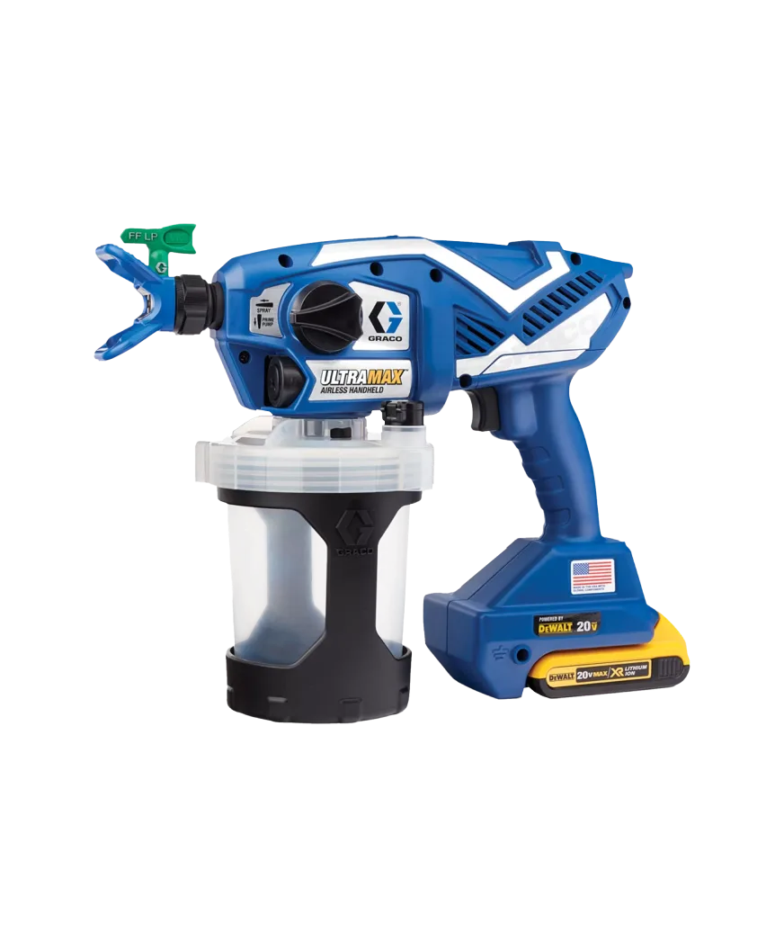 Hand-held sprayer capable of spraying water-based, solvent and flammable architectural coatings. Static shock protection eliminates the potential for sparks while SmartControl technology delivers a flawless finish with no thinning required.
