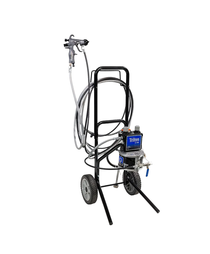 Triton is an air-operated diaphragm spray package that applies a high quality, decorative finish to wood and metal parts. It is a more effective alternative to traditional pressure pots and standard diaphragm pumps.