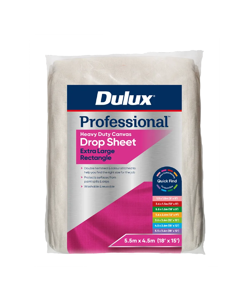 Dulux Professional Heavy Duty Canvas Drop Sheets have FastFind coloured stitching to help you see the size of the sheet before you unfold it. Made from heavy duty, tightly woven canvas for long life durability, they are reversible, washable and reusable. Use to protect surfaces from paint drops and overspray. Double hemmed with colour coded stitching for each size, they are available in 8 sizes plus a value 3-Pack.