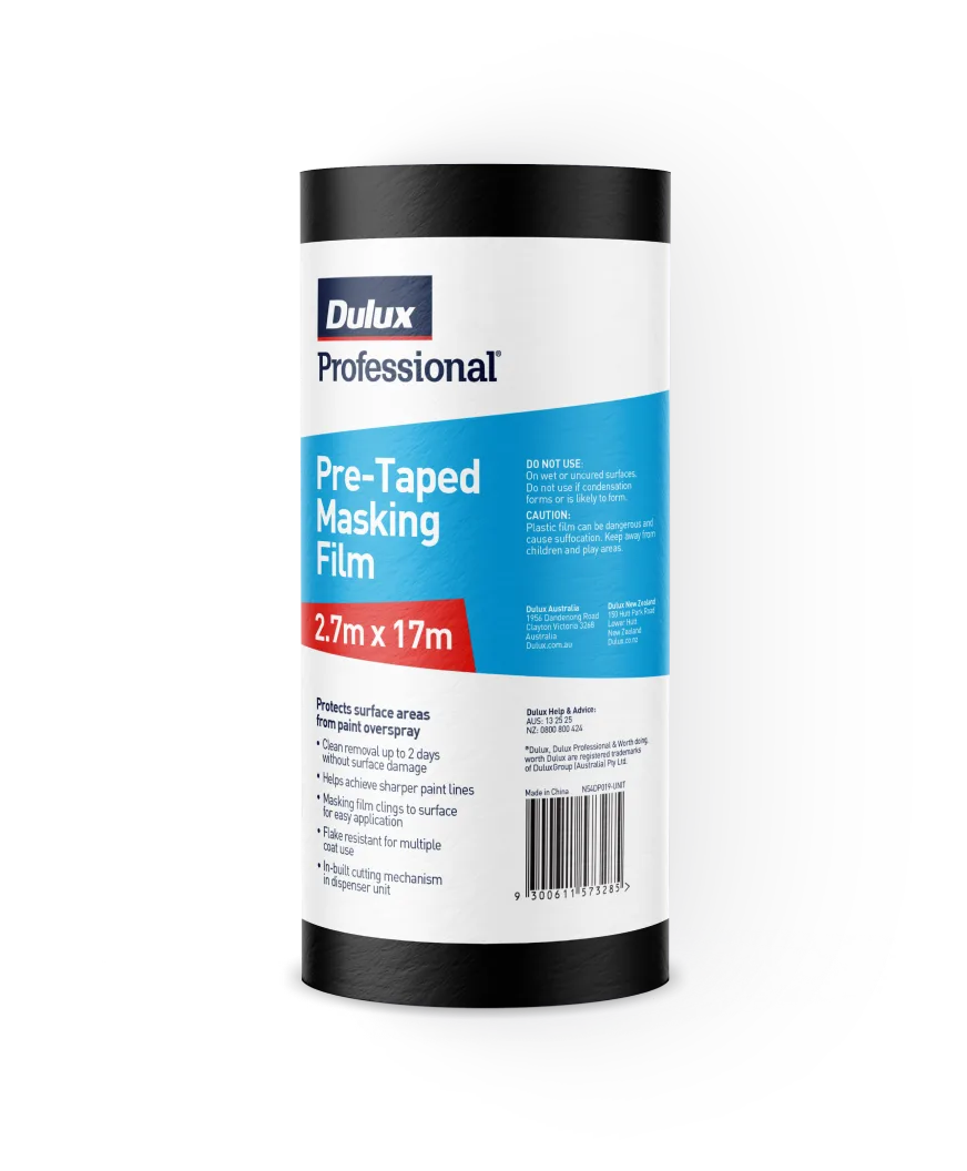 Dulux Professional Pre-Taped Masking Film protects areas from paint drips and overspray. The film is pre-applied with masking tape to for easy application and produce sharp, clean paint lines. The film is corona treated to promote paint adhesion for multiple coat use, and statically charged to assist it to cling to flat surfaces. Dispenser included and refills available.