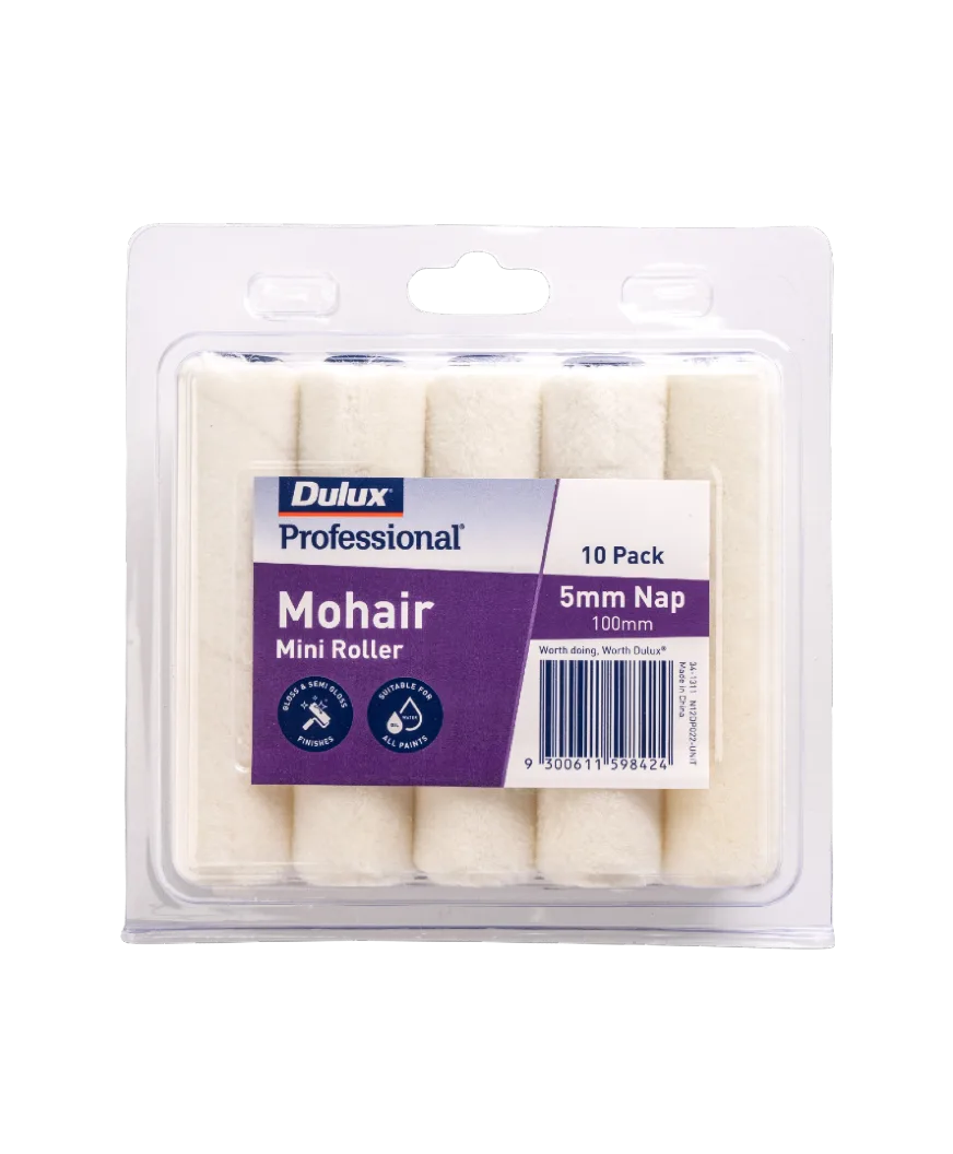 Dulux Professional mini-rollers have a smaller diameter, short length and long handle making them ideal for touch-ups, and applying in small or hard to reach areas. They are available in a range of fibres for different paint types and surfaces.