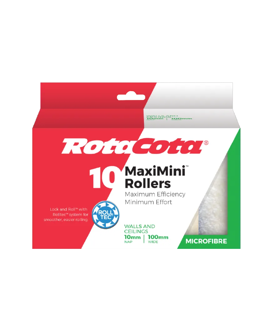 RotaCota MaxiMini® Roller Covers have a jumbo core which means it holds more paint and makes rolling jobs more efficient. 10mm Microfibre nap length is best suited for flat, matt & low sheen paints on walls & ceilings.