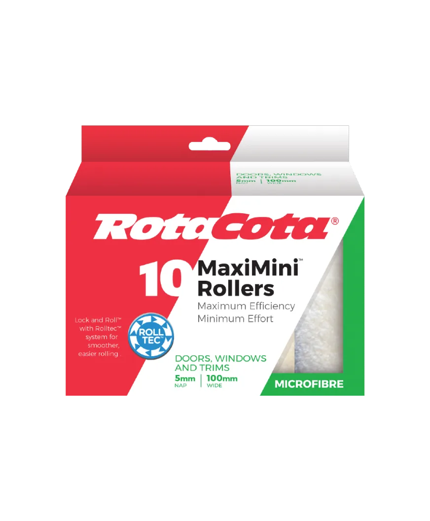 RotaCota MaxiMini® Roller Covers have a jumbo core which means it holds more paint and makes rolling jobs more efficient. 5mm Microfibre nap length is best suited for gloss and semi gloss paints on doors, windows & trims.