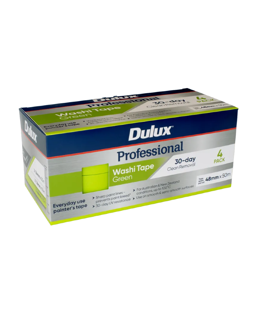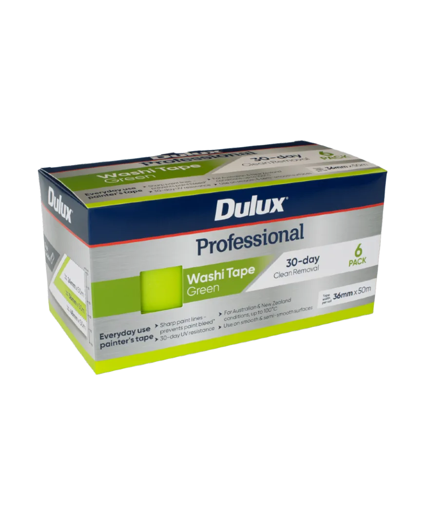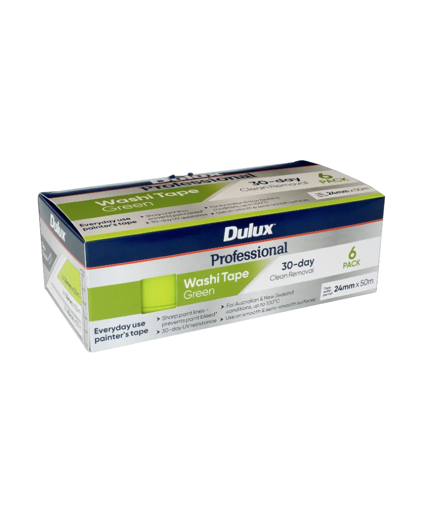 Dulux Professional Green Washi Tape is an everyday painter’s masking tape that produces clean, sharp lines by preventing paint bleed. Made using washi paper, it contains long plant fibres to make it stronger and thinner than crepe-based tapes, and is highly resistant to tearing during removal. 30-day clean removal and 30-day UV resistance makes it suitable for interior and exterior surfaces. It is made for AU and NZ conditions being resistant up to 100ºC. Packaging, tape and core made from FSC® certified paper sourced from responsibly managed forests. Available in 24mm, 36mm and 48mm widths in singles and multi-packs.