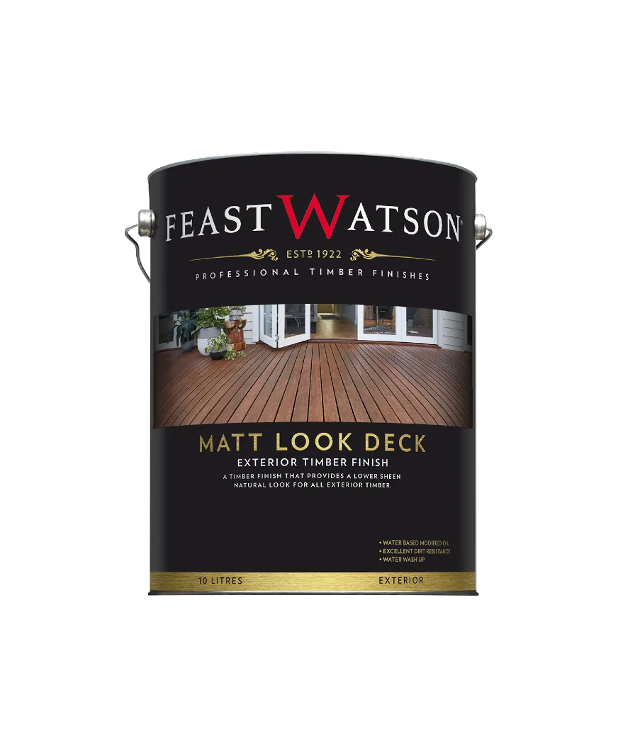 Feast Watson Matt Look Deck is a water based modified oil that provides a lower sheen look and long lasting protection to decking, fences, steps and all exterior timber. The unique formula of Matt Look Deck penetrates timber more effectively than standard acrylic water based timber coatings. It gives a durable lower sheen finish with excellent dirt resistance - which means it's easier to clean and keep your deck looking good between coats.