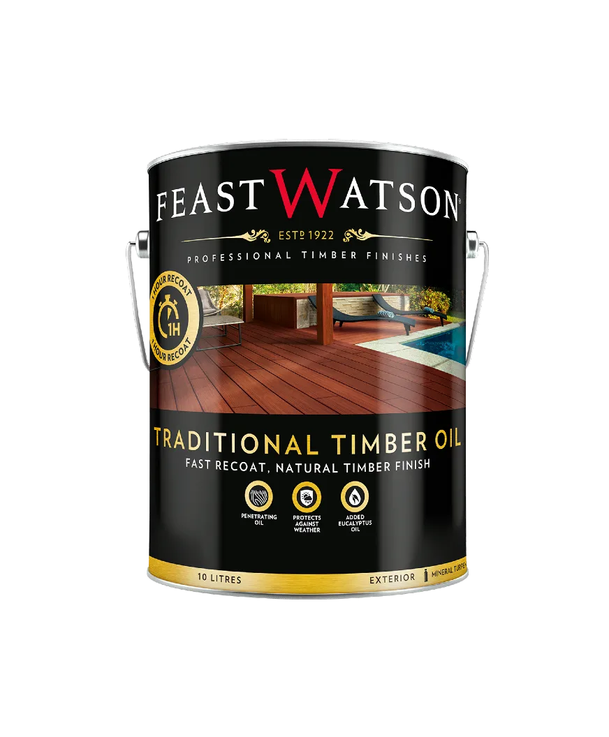 Feast Watson Traditional Timber Oil is a deep penetrating oil for a classic finish on decking and exterior timber. Traditional Timber Oil protects timber against the destructive effects of weather and mould growth. The added eucalyptus oil naturally dissolves gum residue and grease, ensuring an even finish. Traditional Timber Oil is a warm natural colour which can be tinted to highlight the character of timber species. Traditional Timber Oil weathers naturally and will not crack or peel and is ideal for use on all exterior timber including decking, steps, fences, gates, posts and beams.