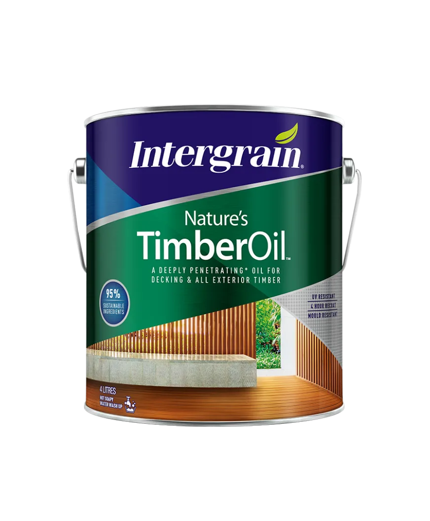 Intergrain Nature’s Timber Oil is a natural, oil based timber finish made from 95% sustainable ingredients. The penetrating formula replicates timber’s natural defences against aging, saturating the cells to protect against drying out. Added ingredients give resistance to water, UV and mould. The natural ingredients in Nature’s Timber Oil give a rich, natural oiled finish. Nature’s Timber Oil is available in a lightly pigmented natural colour or mild timber tones to highlight the characteristics of popular timber species. Nature’s Timber Oil is fast drying, allowing two coats to be applied in one day, and will weather naturally, without risk of cracking, blistering and peeling. Environmentally responsible - Intergrain Nature’s Timber Oil consists of 95% naturally derived renewable materials, an environmentally responsible option compared to many coatings, containing mostly petrochemical based ingredients. Nature’s Timber Oil has about half the VOCs (volatile organic compounds) of traditional oil based finishes.