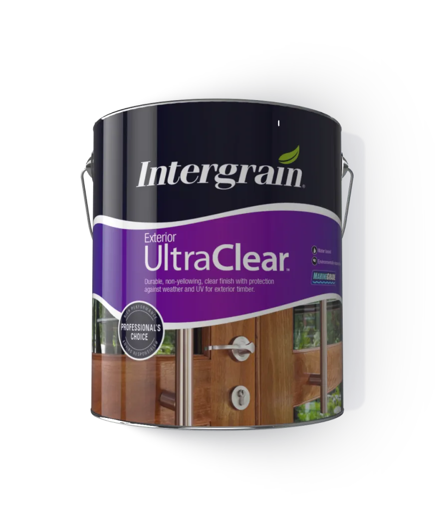 Intergrain UltraClear Exterior is a tough, clear, marine grade water based timber finish for use on window frames, doors and trims. Incorporating UV absorbers, UltraClear Exterior provides superior protection against the weather including the harmful effects of the sun’s UV radiation. Available in gloss and satin, UltraClear Exterior has a low odour and unlike oil based coatings will not yellow. Easy to apply and fast drying, UltraClear Exterior allows for several coats to be applied in one day. UltraClear Exterior may be applied over Intergrain NaturalStain™ to give a gloss or satin finish. Note: UltraClear Exterior is not suitable for coating areas subject to foot traffic. The UV absorber system in UltraClear Exterior will impart a subtle transparent brown tint. Environmentally responsible - Being water based, UltraClear Exterior emits significantly less VOC’s (volatile organic compounds) into the atmosphere than traditional oil based exterior clear finishes. This makes UltraClear Exterior safer to use, and much gentler on the environment.