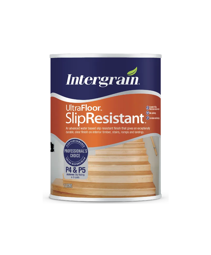 Intergrain UltraFloor SlipResistant allows you to easily meet slip resistance requirements for your interior timber floors, stairs, ramps or landings. UltraFloor SlipResistant does not require an additive, allowing you to exceed P4 and meet P5 slip resistance requirements in just three simple coats. UltraFloor SlipResistant is low odour and fast drying, enabling projects to be finished within one day. Environmentally Responsible - Being water based, UltraFloor SlipResistant emits significantly less VOC’s (volatile organic compounds).