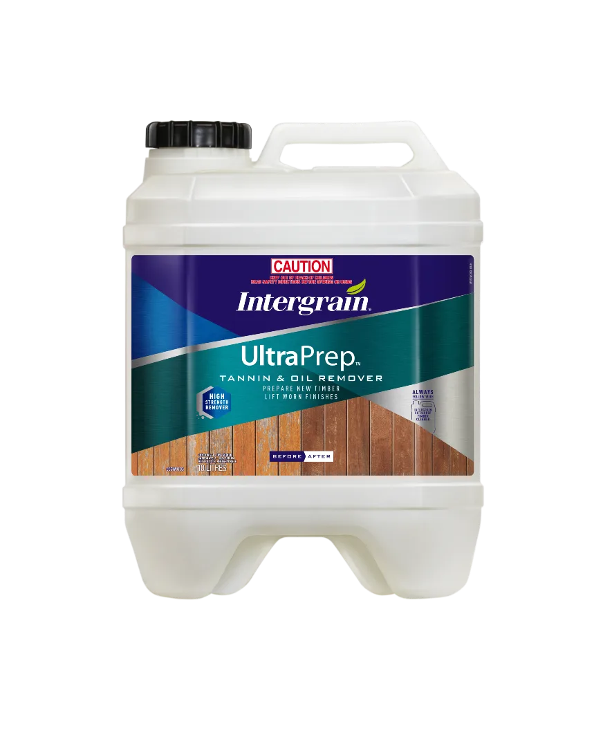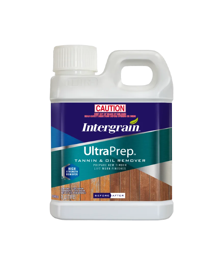 Intergrain UltraPrep™ Tannin & Oil Remover is a powerful, high strength remover. Specially formulated to quickly draw out tannins and oils from the surface of exterior timber. The high strength formula also lifts old or worn existing timber finishes.<br><br>Note: Intergrain UltraPrep Tannin & Oil Remover is not a paint and varnish stripper, to remove sound coatings use a coatings stripper or sand off.