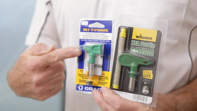 Spray Tips: LP (Low Pressure) tips have less overspray as they reduce the film speed, so the paint doesn’t bounce back off the surface. Allow for more deliberate spraying.